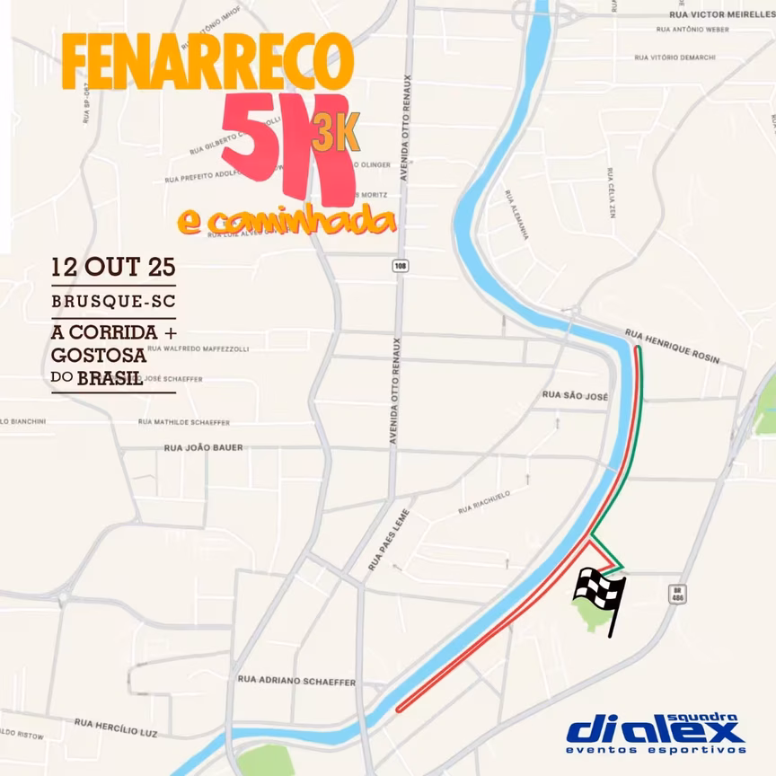 A largada está prevista para às 7h30, em frente à Arena Brusque, com trajeto pelas ruas Gentil Battisti Archer, Oscar Carlos Muller e avenida Bepe Roza.