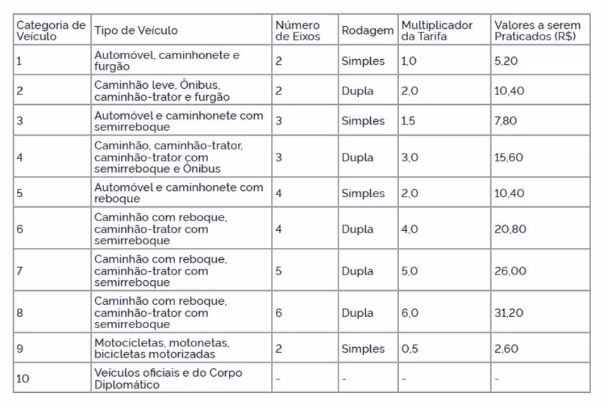 Sendo assim, a tarifa básica do pedágio passa de R$ 4,90 para R$ 5,20. Os pagamentos dos pedágios podem ser efetuados por dinheiro em espécie e cartão de débito.