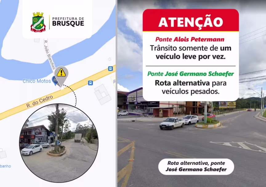 Assim, a partir desta quinta-feira o trânsito de veículos leves na ponte do bairro Rio Branco seguirá a orientação técnica do engenheiro responsável pelo laudo de avaliação estrutural. Otráfego de veículos pesados passará a ser obrigatório pela rota alternativa, via ponte José Germano Schaefer (ponte do Pilolo).