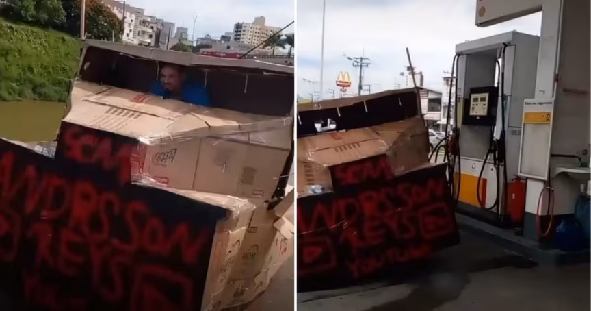 Andersson Reys, de 27 anos, é o morador de Brusque que viralizou nas redes sociais após ter sido flagrado circulando com uma réplica de caminhão feita de papelão. O flagrante aconteceu na terça-feira, 25, por diversos moradores da região.