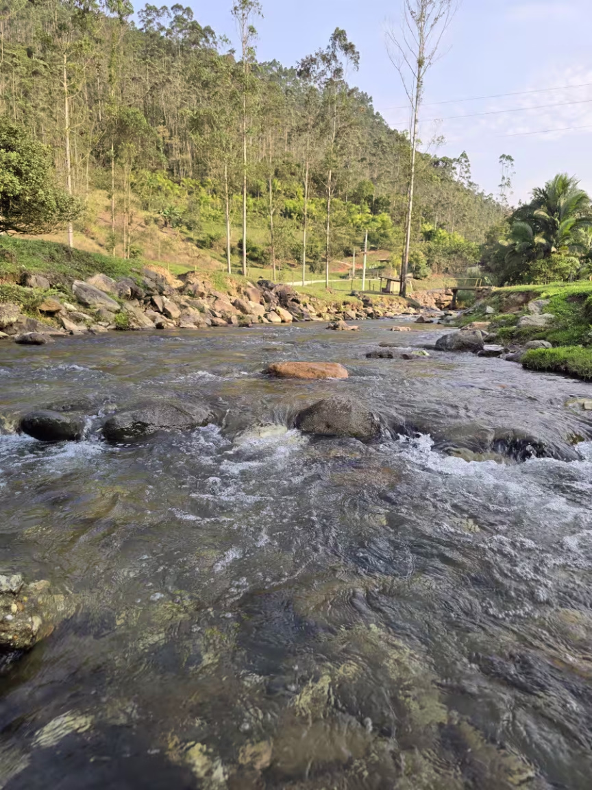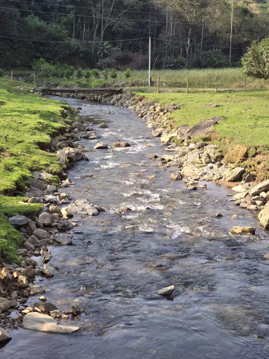 Um riacho de águas cristalinas serpenteia graciosamente pelo terreno, contornando cada detalhe da paisagem e oferecendo um espetáculo de sons e movimentos que parecem desacelerar o tempo.