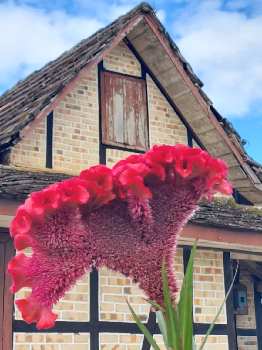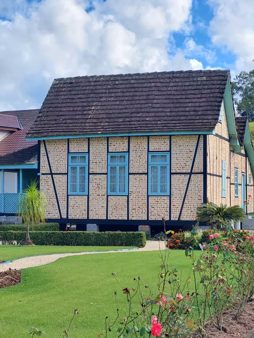 As casas em estilo enxaimel, deslumbrantes em sua arquitetura, contrastam com as belas paisagens, enquanto o majestoso morro do Spitzkopf serve de moldura para essa magnífica composição.