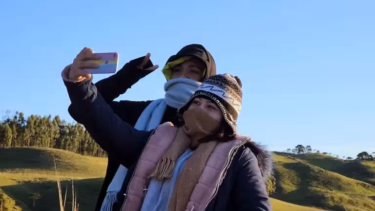 E para encarar o frio atípico no lugar, as roupas de inverno fizeram parte da vestimenta como toucas, luvas, casacos pesados e cachecóis, enquanto apreciavam a gélida paisagem esbranquiçada do imponente Vale, a 3km do Centro da cidade joaquinense.