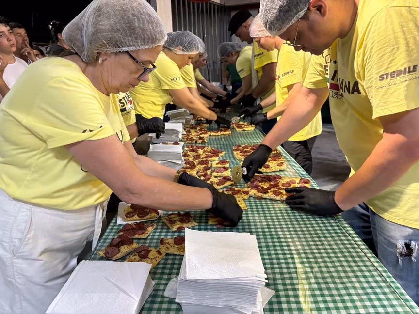 O preparo da pizza começou cedo, às 9h. Por volta das 16h, ela começou a ser assada. O corte, momento mais esperado, aconteceu às 21h30.