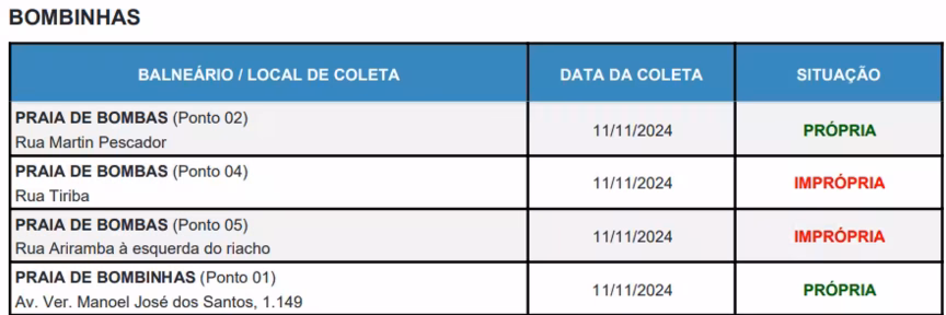 O Instituto do Meio Ambiente de Santa Catarina (IMA-SC) divulgou um novo relatório da qualidade da água do mar das praias perto de Brusque. Os resultados do monitoramento foram publicados nesta quarta-feira, 13, dois dias antes do feriado de Proclamação da República.