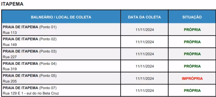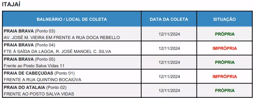 Em Itapema, Meia Praia está com um único ponto impróprio para banho, na região da rua 205. Os demais locais monitorados na praia estão próprios. A praia do Porto também foi considerada própria, conforme o relatório.