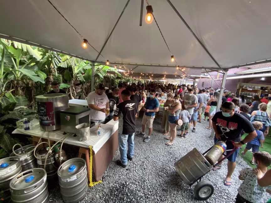 Na entrada, diversos familiares e amigos aguardam para conhecer ou revisitar a tradicional Pelznickelplatz, em Guabiruba, no fim da tarde deste domingo, 12. Organizada pela Sociedade do Pelznickel, o espaço fica localizado na rua Nicolau Schaefer, no bairro Imigrante, e voltou a receber público após dois anos, por conta da pandemia da Covid-19, na última sexta-feira, 10.